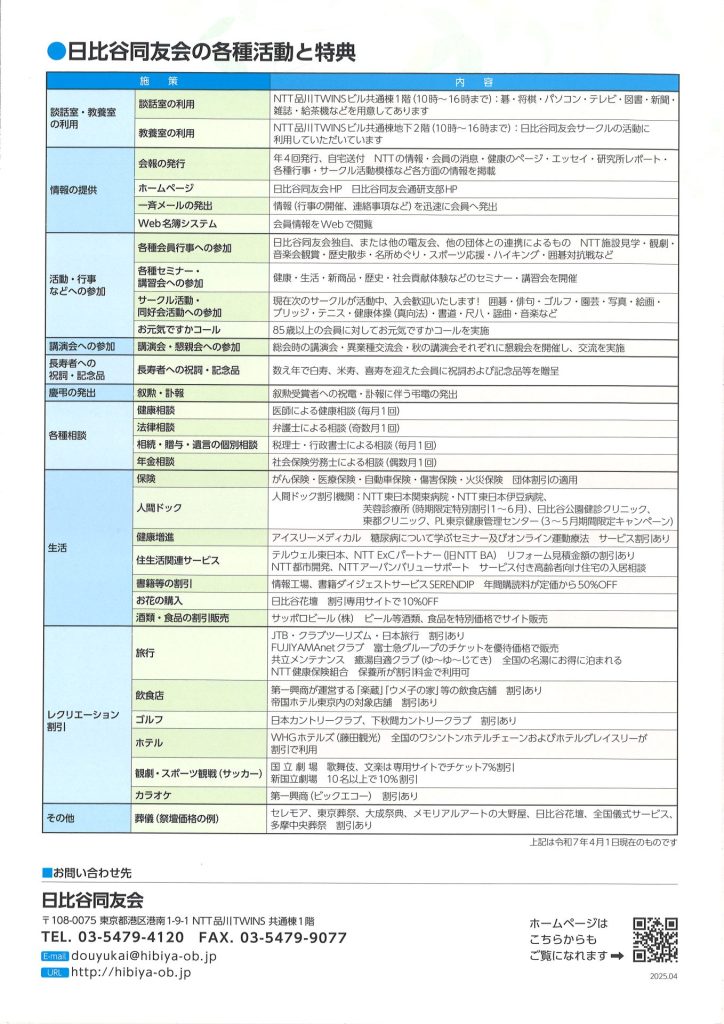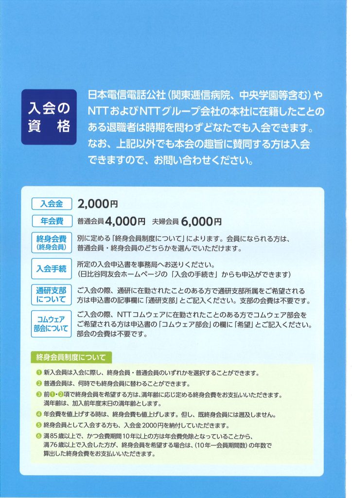 入会案内 2025.03.23 ご入会をご希望される方はこちら ご入会フォーム グループリンク 入会案内(PDF) グループリンク キャンペーン 夫婦割引会費について 夫婦割引会費の実施 日比谷同友会へ入会されているまたは入会される会員について、夫婦割引会費の制度を導入します。なお、ご夫婦について、発行する会報や名簿は各々1冊を送付することとします。 夫婦割引会費の額 夫婦で一括支払いとして年間6,000円(現行より▲2,000円となる)とします。 時期 H27年度会費支払いより実施します。 お申し込み 事務局の方に夫婦割引適用についてお申込み下さい。 ご入会フォーム グループリンク
