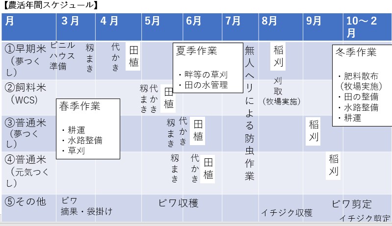 これらの米作は、稼働分散と、台風災害のリスク回避のため、いわゆる時間差育成で実施され、下図にあるように、早期米、普通米など作付け時期をずらしながら、春3月から9月末にかけて、栽培されているようです。