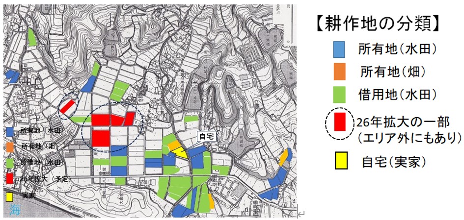 農業を始めた時は全くの素人で、高齢のため農家を辞めたばかりの親から教えを請い、耕作地の一部を使って、農業を開始。お父様が他界されて後は、自分自身で毎年、工夫・実践して「農家」を営んでいるそうです。この5年程、近隣の農家から耕作依頼があり、担当する耕作地はどんどん増大する一方で、来年の耕作地は、更に2haほど増える予定のようです。