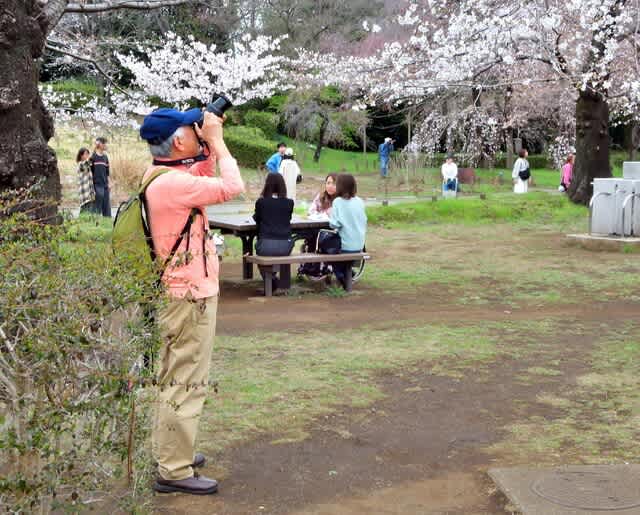 直近での桜満開予報は28日頃となっていましたが、当日「神代植物公園」では少し遅れ気味ではありました。一方天候は、心配していた雨も明け方上がり、暑いくらいで上着を脱ぐ陽気となりました。現地では、4月6日まで「さくらまつり」が開催されており、「日本テレビ」が取材に来ていました。そして名物の「神代植物公園神代曙(原木)」も見頃となって、われわれを迎えてくれました。